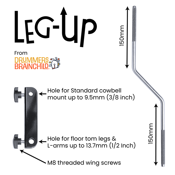 The Leg-Up attaches to the leg of your floor tom. In fact, it will attach to any pole up to 12/7mm (half inch) in diameter, so that’s also a tom arm or a boom arm – cool right?