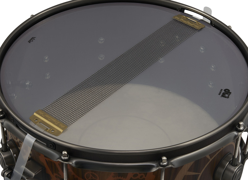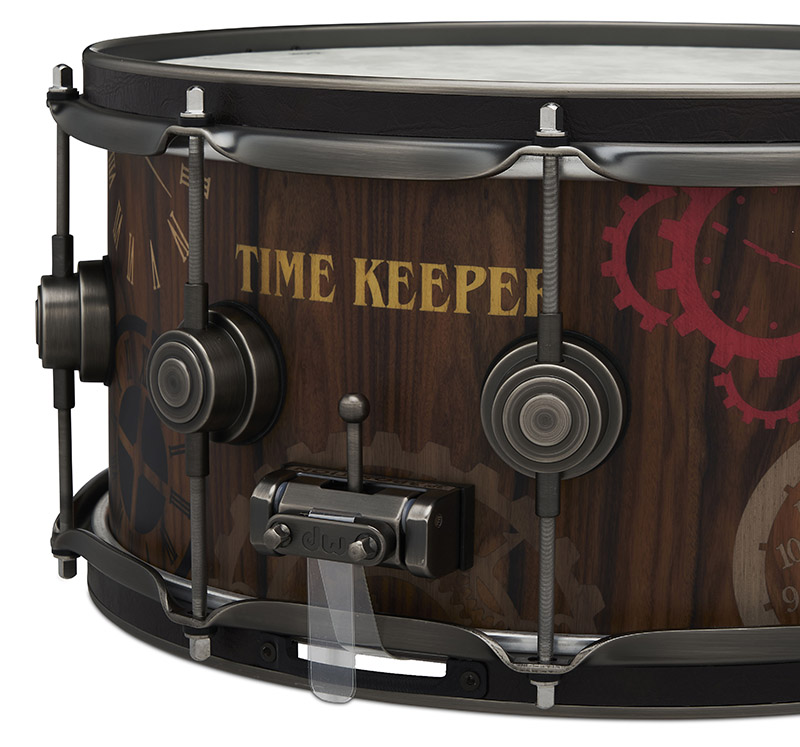 Drum Workshop Inc. (DW) recently announced the official launch of the Collector’s Series “Timekeeper” Snare Drum. Aptly named, the drum is decorated with “Clock and Gear” wood inlays, three hundred and fifty-one individual pieces, to be exact. Each piece of exotic and dyed laser cut material is meticulously hand-inlayed into the 1/36” thick top veneer of a Pure Purpleheart shell.