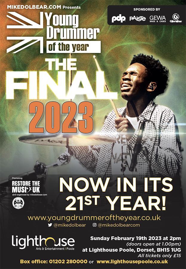 Sunday 19th of February 2023 at the Lighthouse, Poole at 1pm, the longstanding and established event ‘Young Drummer Of The Year’ hosted and organised by Mike Dolbear, returns for its 21st year, brings finalists together for the competition finale.
